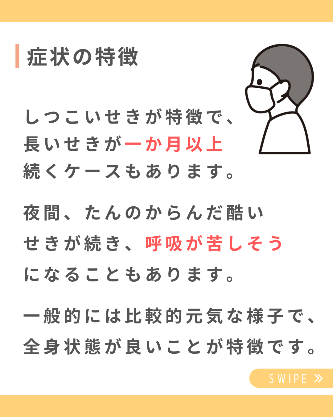 しつこいせきが特徴で、長いせきが1カ月以上続くケースもあります。