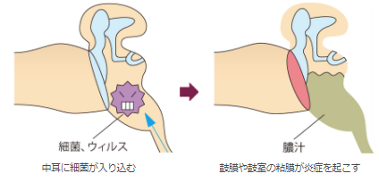 - 鼓膜や鼓室の粘膜が炎症を起こす