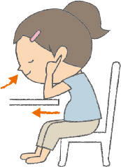 ❶ イスに座ってテーブルに両ひじをつき、上体を前に傾ける。手の人差し指を両耳の中に浅く入れ、目を閉じる