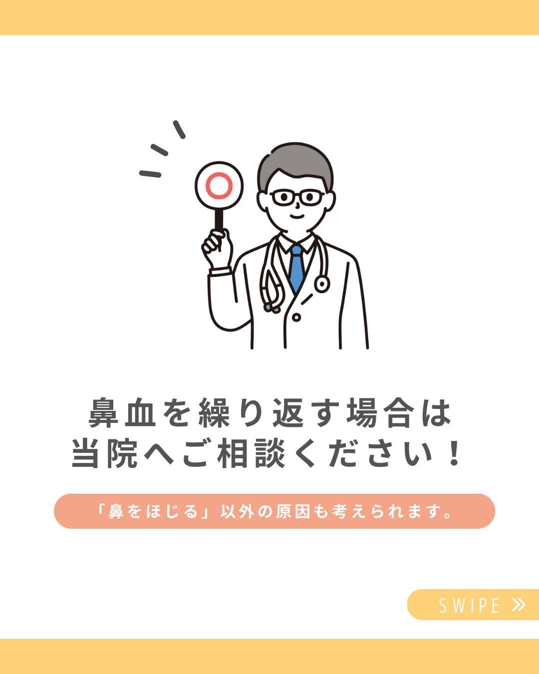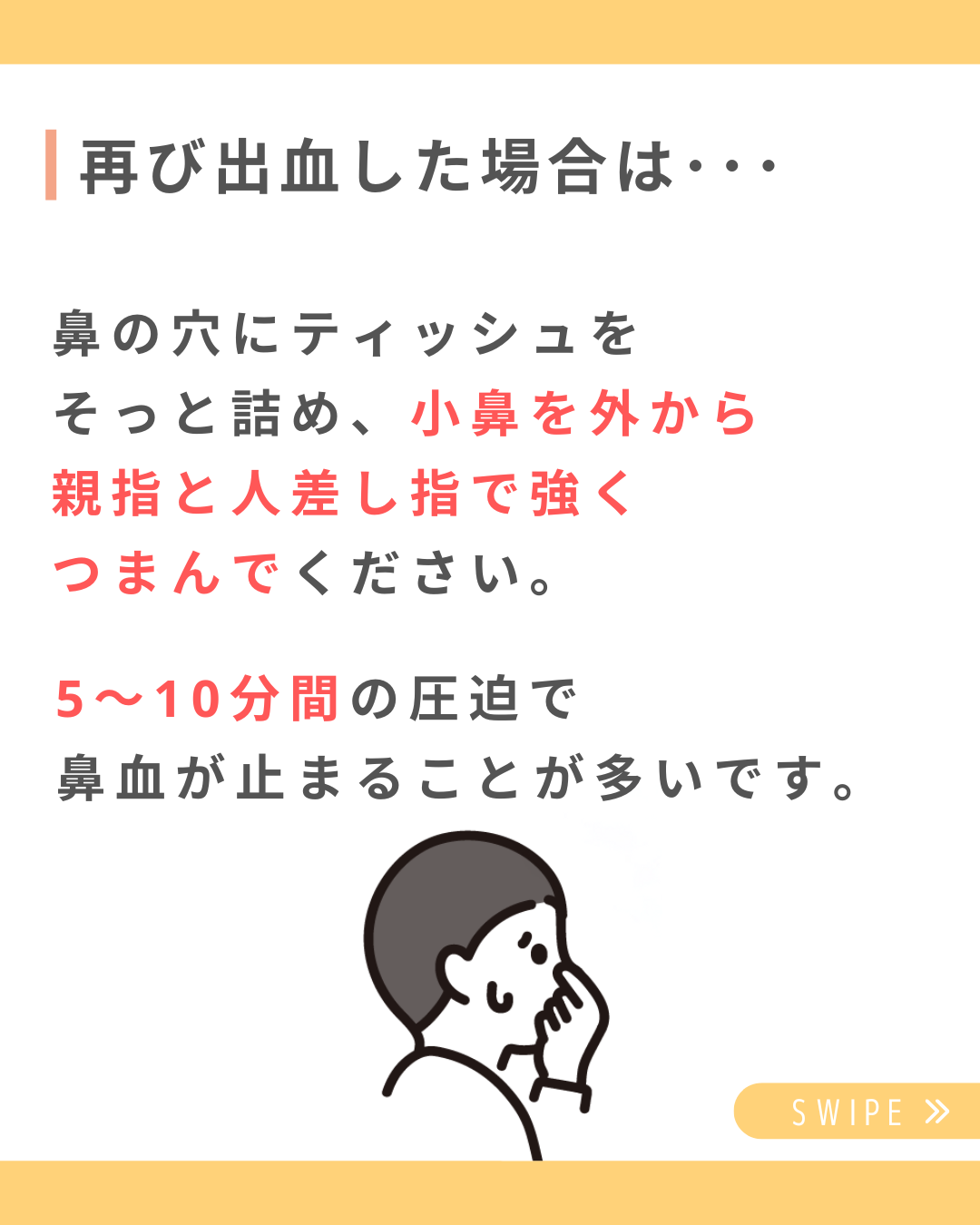 5~10分間の圧迫で鼻血が止まることが多いです。